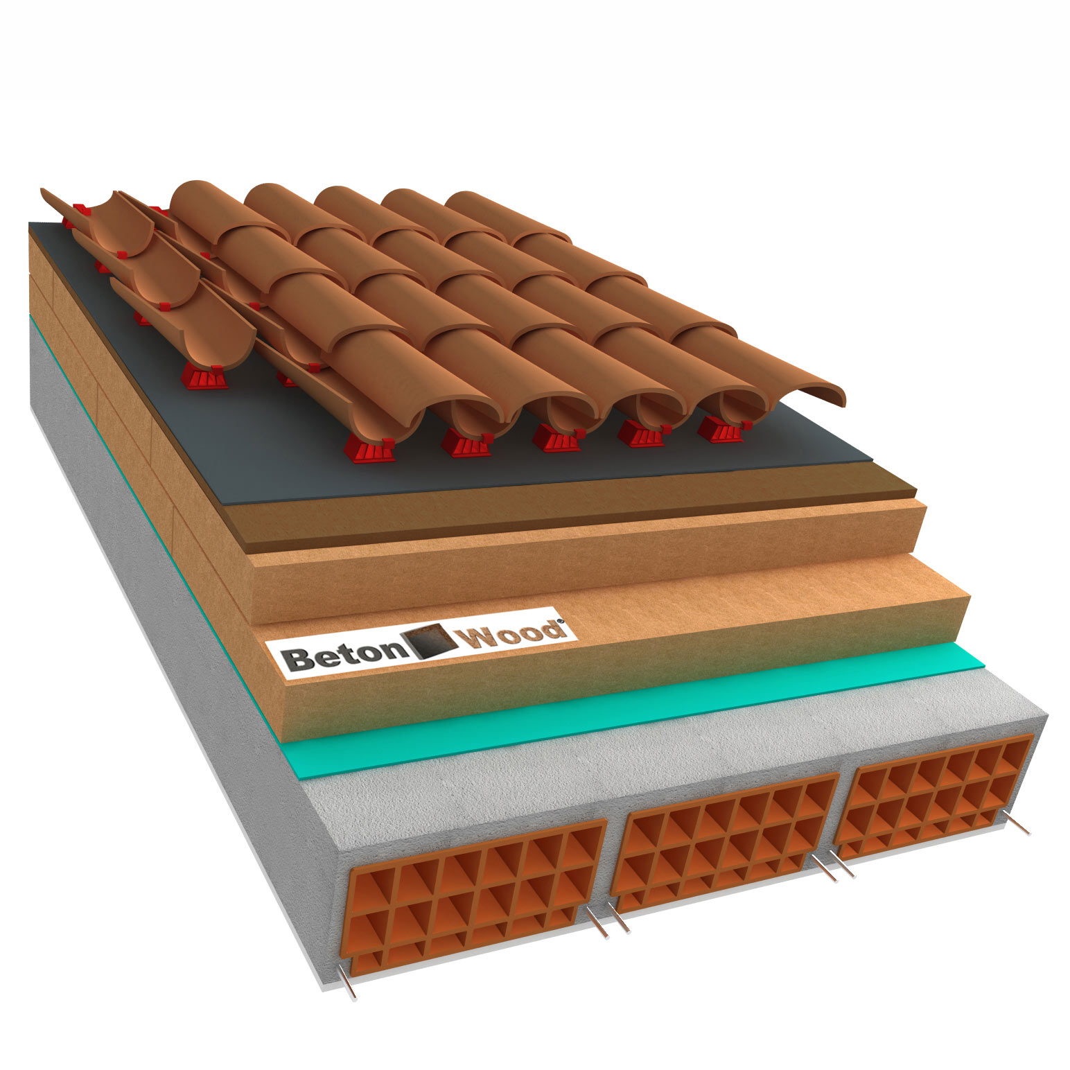 Sistema per tetto su latero-cemento in fibra di legno Therm e fibra di legno bitumata ad elevata densità e resistenza a compressione e strato in cementolegno BetonWood. Strato ventilato garantito da supporti tipo Aercoppo.